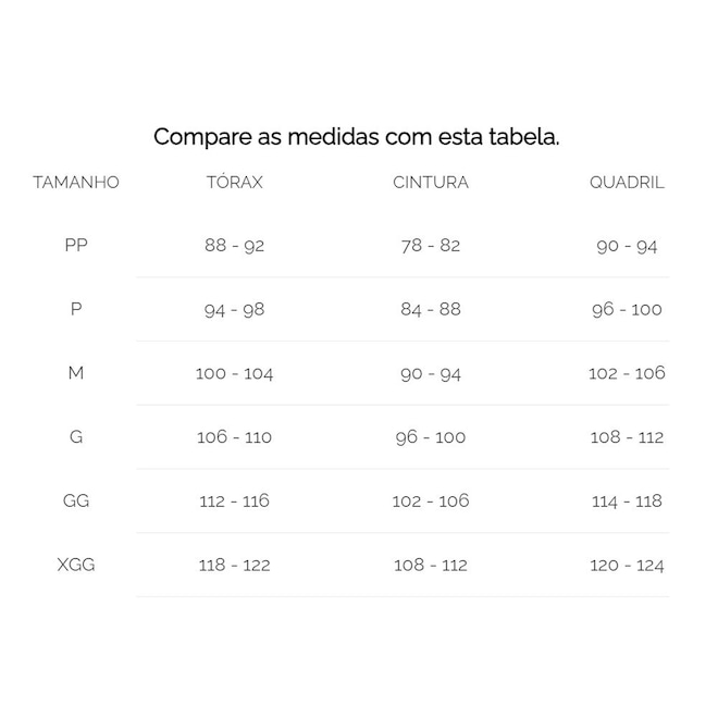 Tamanho | Tórax | Cintura | QuadrilPP 88-92 78-82 90-94