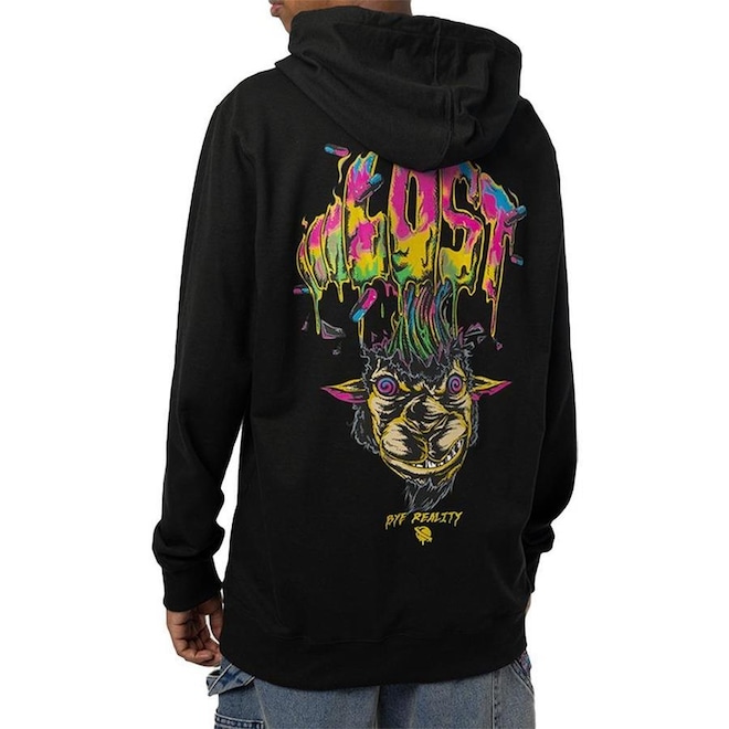 Moletom Lost com bolso frontal amplo, estampas localizadas no peito e costas, punhos e barra com elástico para maior proteção e estampas em tinta neon que reagem à luz negra.
