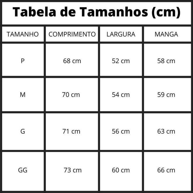 Dimensões Aproximadas: Comprimento (cm) : P - 68/M - 70/G - 71/ GG - 73 Largura (cm): P - 52/ M - 54/ G - 56/ GG - 60 Manga (cm): P - 58/ M - 59/ G - 63/ GG - 66