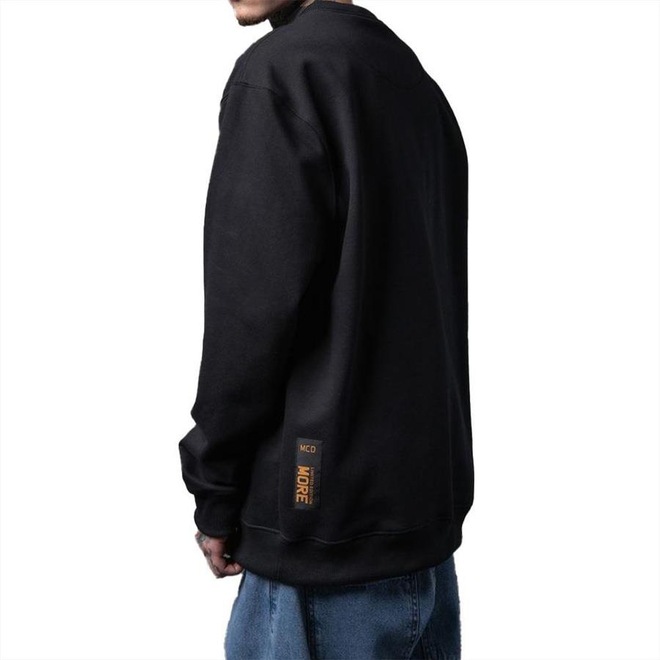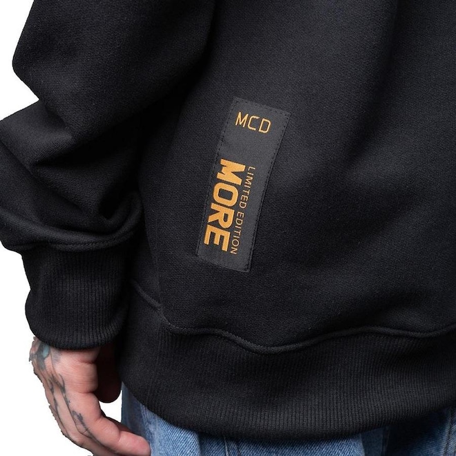 Blusão de Moletom sem Capuz Mcd com gola e punho reforçados, estampa frontal e etiquetas personalizadas.