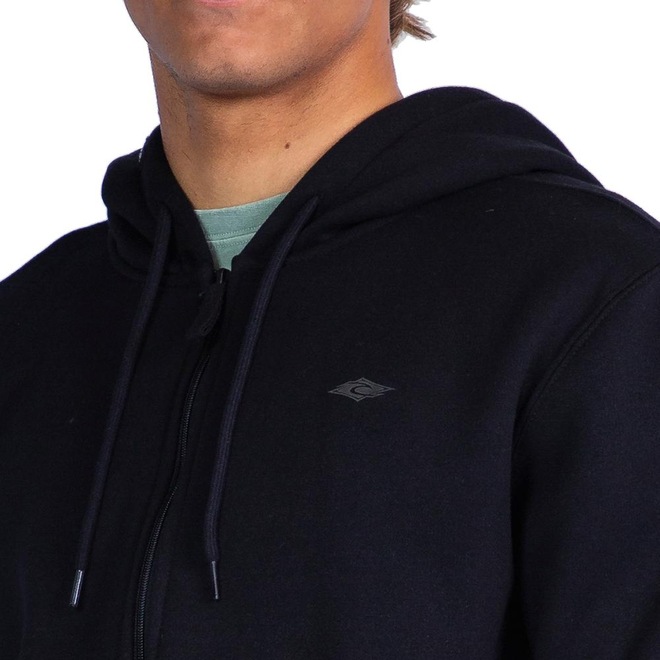 Moletom Rip Curl Aberto 250g, fechamento em zíper, logo em relevo no peito, ajuste de cordão no capuz, cordão com ponteira de metal e etiquetas personalizadas.