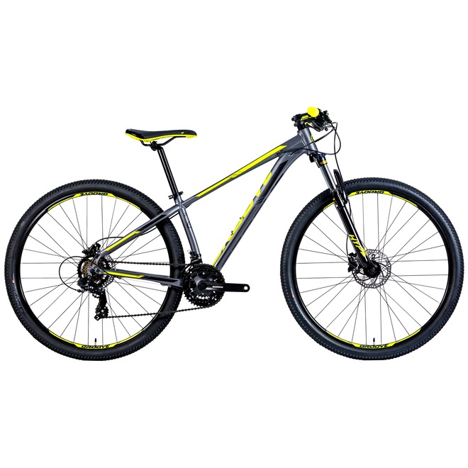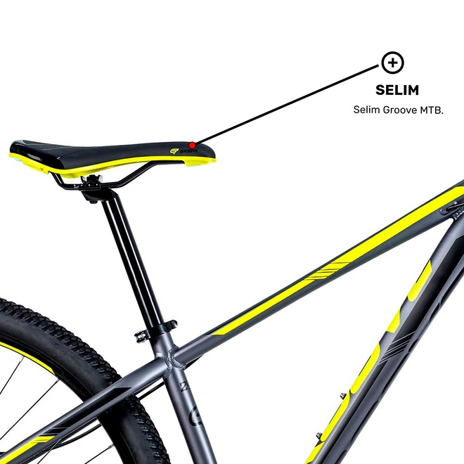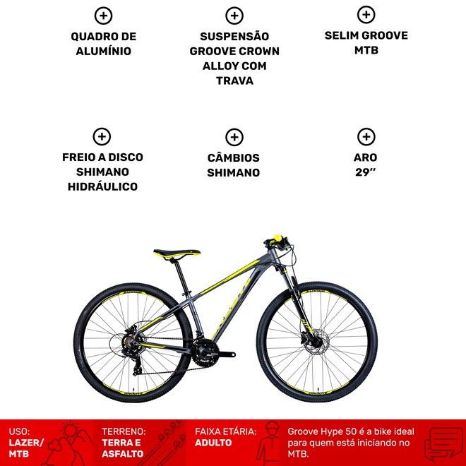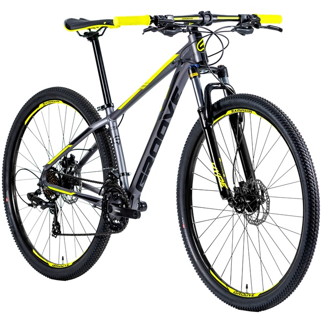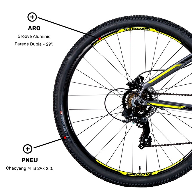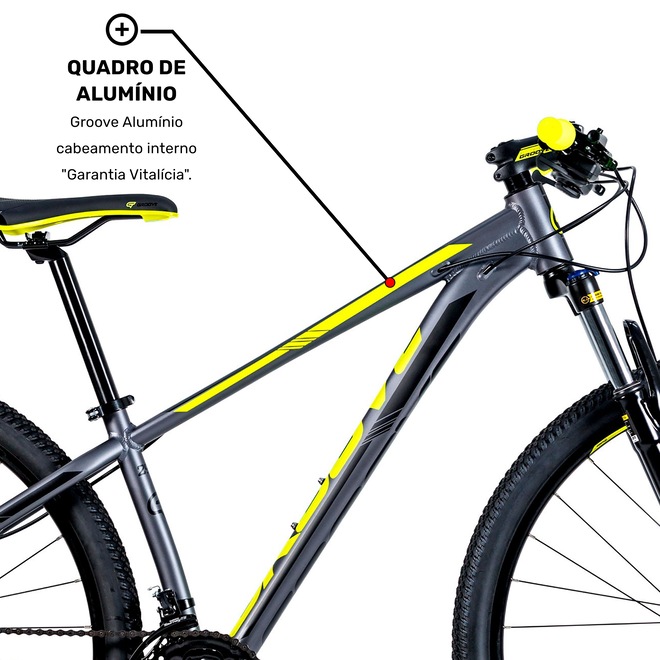 A qualidade Groove está em todos os detalhes, possui aro 29 de alumínio de parede dupla, 24 marchas, freios Shimano Hidraulico BR-MT200 Rotor Shimano RT10 160mm Center Lock, manopla 130mm com trava de um lado e quadro em alumínio.