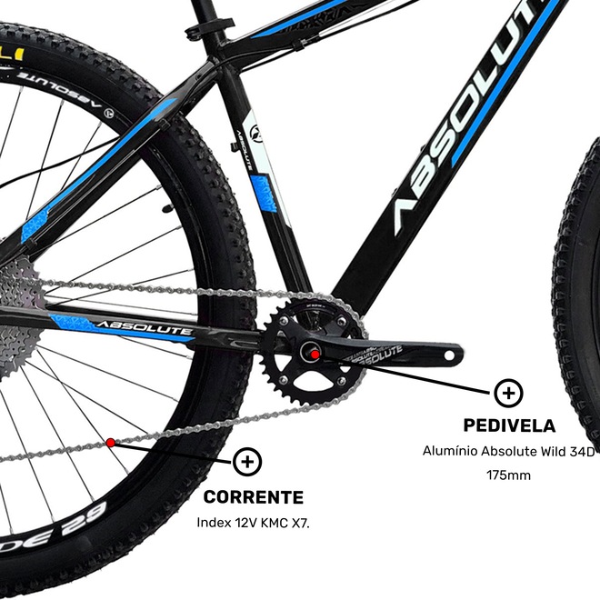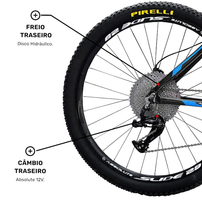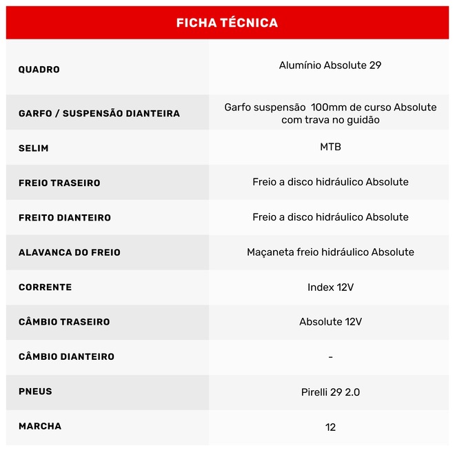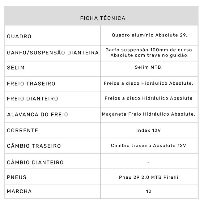 Para te acompanhar nas aventuras, a Absolute apresenta a Mountain Bike 1X12.Com qualidade em cada detalhe é a escolha perfeita para quem prioriza o bem-estar físico e mental, afinal o ciclismo permite momentos incríveis com os amigos e até mesmo com a família.De aro 29 aero de alumínio parede dupla, a Bike Absolute possui 12 marchas, freios em disco hidráulico, pneus 29 2.0 MTB Pirelli e raios em aço.Ainda conta com corrente Index 12V, pedais em nylon MTB, movimento central selado e movimento de direção integrado.Compre já sua mountain bike Absolute e construa memórias inesquecíveis!ref: 968065