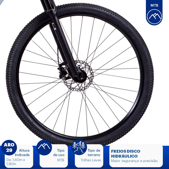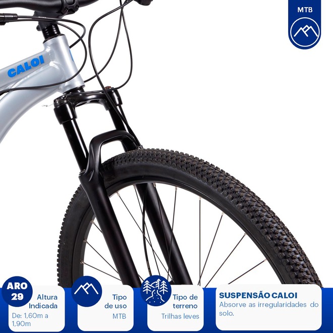 Quadro Alumínio 6061 tratado, conformado, com suporte de freio a disco standard e gancheira removível. Garfo/Suspensão Dianteira Suspensão Caloi com 100mm de curso e trava no guidão Aro Blackrock29
