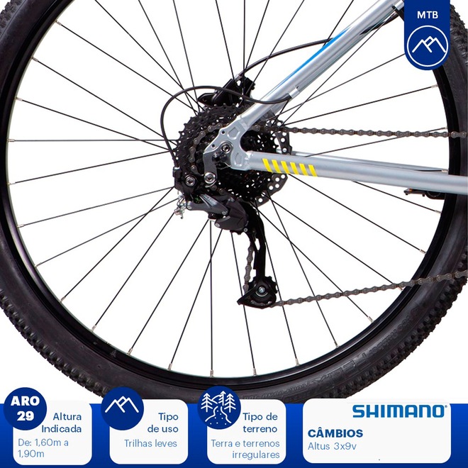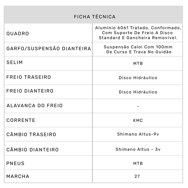 29Cubo Aço com Quick Release Cubo Traseiro Alumínio com Quick Release Raios Inox Pneus MTB Pedal Plástico Pedivela Shimano Movimento Central Feimin Corrente KMC Cassete/Roda Livre Sunrace - 9v Câmbio Traseiro Shimano Altus-9v Câmbio Dianteiro Shimano Altus - 3v Passador / Alavanca de Câmbio Shimano Altus Guidão MTB Alumínio 31.8x720mm Mesa/Suporte do Guidão MTB Aluminio - 31.8x75mm - 7° Manopla Borracha Movimento de Direção Semi-integrado Freio Dianteiro Disco Hidráulico Freio Traseiro Disco Hidráulico Selim MTB Canote do Selim Alumínio - 27.2x400 mm - Ajuste com quick release Marchas 27 Peso Máximo Suportado (kg) 100 Garantia do Fornecedor Contra Defeito de Fabricação Conteúdo da Embalagem 1 Bicicleta Desmontada SAC do Fornecedor CALOI: 0800 701 8022 e Grande São Paulo (11) 5853-2744