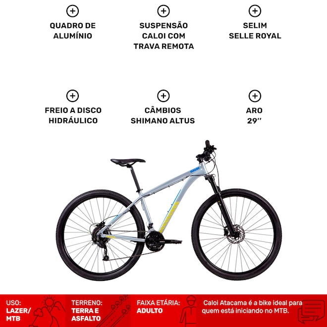 O ciclismo é um esporte bastante vasto, praticado por milhões de pessoas no mundo todo. Pensando nisso a Caloi apresenta a Mountain Bike Caloi Atacama, é a opção ideal para os momentos de lazer e prática esportiva.