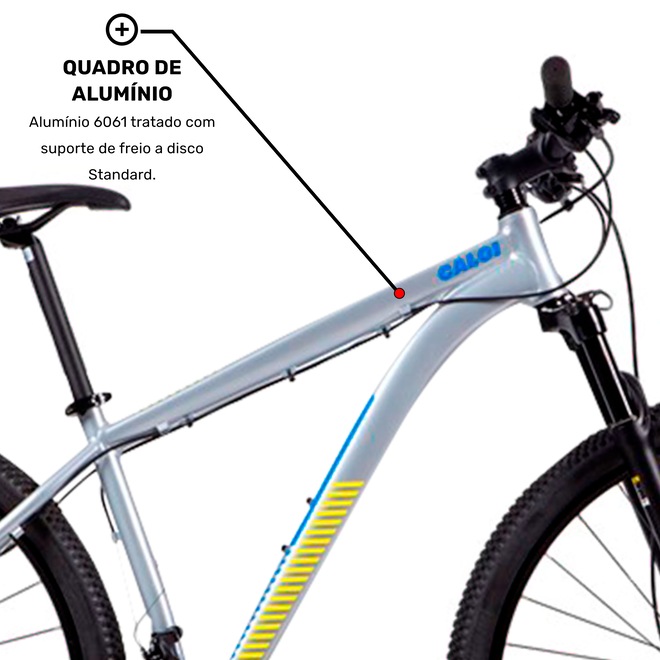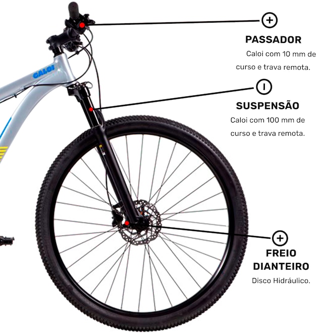 Ocasião de Uso Trilhas Leves Gênero Unissex Faixa Etária Adulto Quadro Alumínio 6061 tratado, conformado, com suporte de freio a disco standard e gancheira removível. Garfo/Suspensão Dianteira Suspensão Caloi com 100mm de curso e trava remota Aro Blackrock29