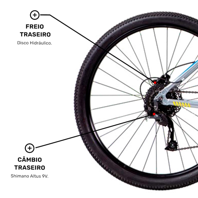 Projetada com design moderno em alumínio, proporciona estabilidade com leveza durante suas pedaladas. Essa Bike oferece câmbio traseiro Shimano Altus-9v, que garante segurança, ajudando a você ter alta performance enquanto se exercita.