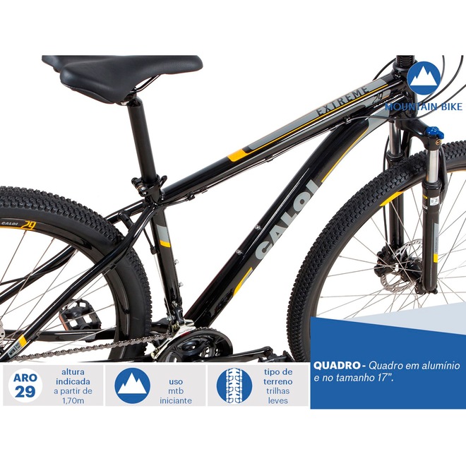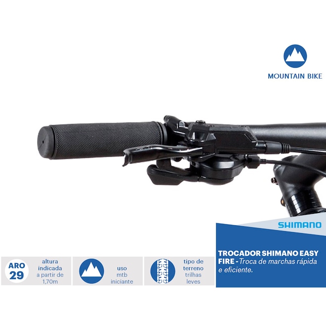 Indicada para iniciar nas aventuras do MTB, a Caloi Extreme Aro 29 apresenta quadro em alumínio 17” e suspensão dianteira com trava mecânica para maior absorção dos impactos nos terrenos. A Caloi Extreme 29 possui câmbio dianteiro e traseiro Shimano com trocador de marcha Easy Fire para mais precisão e rapidez no aumento ou diminuição do ritmo e velocidade nos percursos, conforme sua performance. Já o freio a disco hidráulico Logan garante bom desempenho e mais segurança, além de pneus mais largos para estabilidade e controle nas trilhas. Não perca a oportunidade e sinta os benefícios do esporte com o padrão de qualidade Caloi. Adquira já a sua!