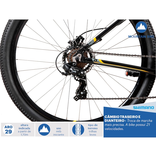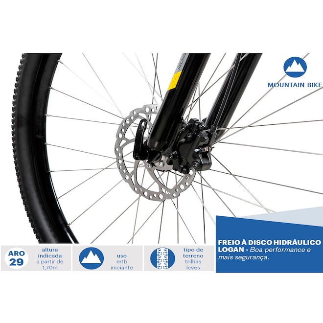 MontanhaGênero Unissex Faixa Etária Adulto Aro 29 Marchas 21 Alavanca do Freio Logan Hidráulico Freio Dianteiro Disco Hidráulico Freio Traseiro Disco Hidráulico Manopla Velo Folha do Aro Parede Dupla Cubo Alumínio com Quick Release Cubo Traseiro Alumínio com Quick Release Pneus MTB 29 X 2,10" Raios Inox Câmbio Traseiro Shimano Tourney - TZ300 - 7v Corrente KMC - X7 Pedivela Aço - com chain guard - 170mm - 42/34/24 Movimento Central Três (03) partes Movimento de Direção Semi-integrado Pedal Plástico Selim Selle Royal Guidão Alumínio 31.8 X 680 mm Peso Máximo Suportado (kg) 100 Conteúdo da Embalagem 1 Bicicleta Desmontada SAC do Fornecedor CALOI: 0800 701 8022 e Grande São Paulo (11) 5853-2744 Garantia do Fornecedor 2 anos no Quadro