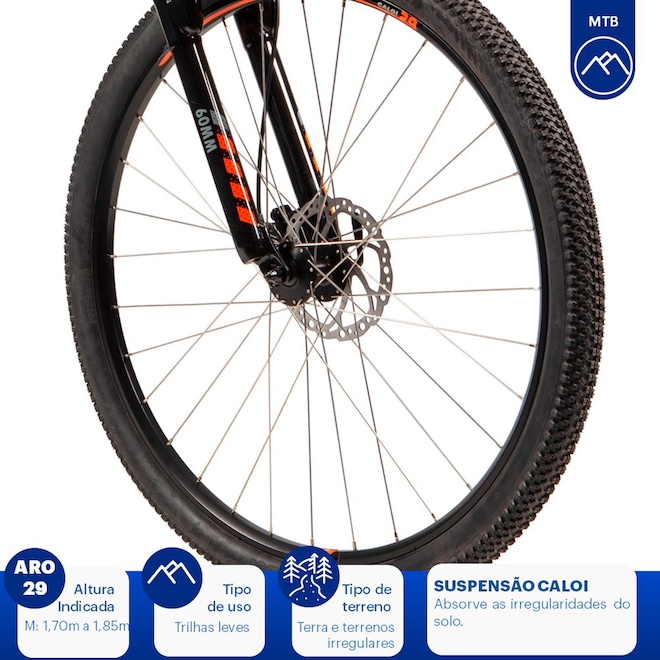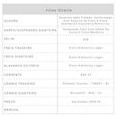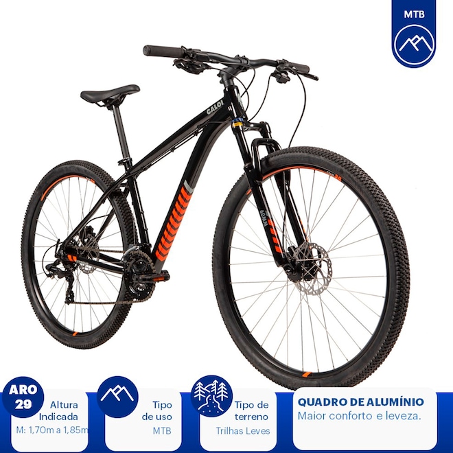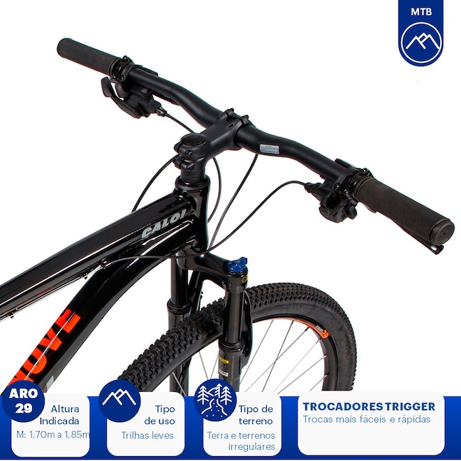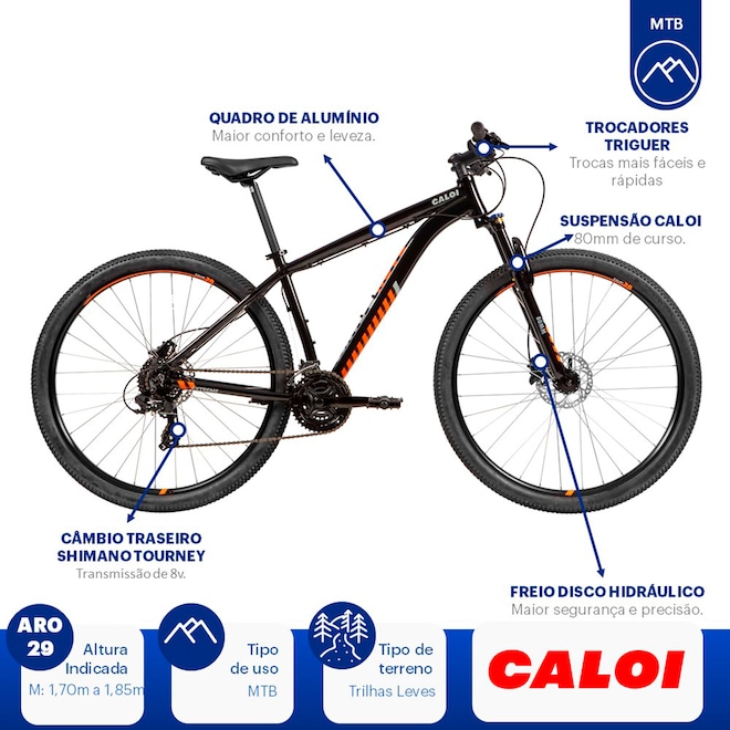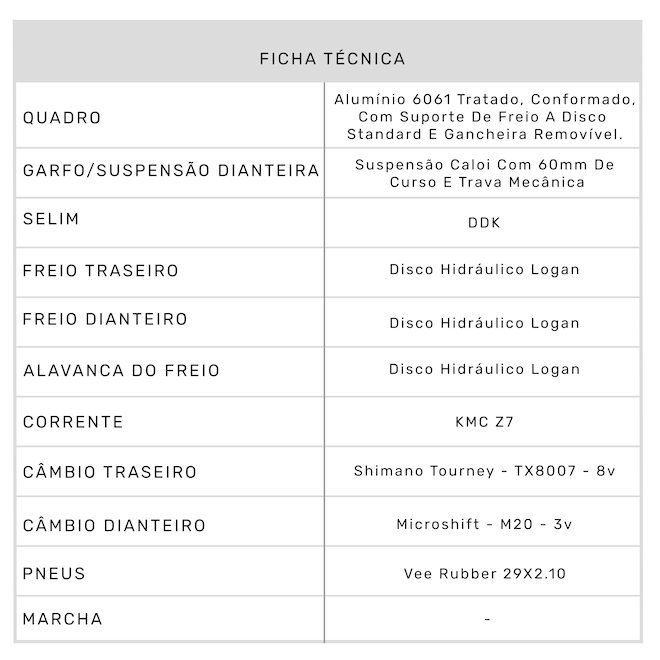 Ocasião de Uso Montanha Gênero Unissex Faixa Etária Adulto Aro 29 Alavanca do Freio Disco Hidráulico Logan Freio Dianteiro Disco Hidráulico Logan Freio Traseiro Disco Hidráulico Logan Manopla Velo Quadro Alumínio 6061 tratado, conformado, com suporte de freio a disco standard e gancheira removível. Folha do Aro Aro Rodi Blackrock 29 - Parede Dupla Cubo Shimano Tourney - TX506/32F Cubo Traseiro Shimano Tourney – TX506/32F Pneus Vee Rubber 29X2.10 Raios Inox Câmbio Traseiro Shimano Tourney - TX8007 - 8v Passador / Alavanca de Câmbio Microshift - 3/8v Corrente KMC Z7 Pedivela EVERESTT - 175mm - 42/34/24 Movimento Central Feimin – B908 Movimento de Direção FP-H812PL Semi-integrado Cassete/Roda Livre Sunrace 8 velocidades - 11-34D Canote do Selim Alumínio - 27.2x400 mm - Ajuste com quick release Selim DDK Guidão MTB Alumínio 31.8x720mm Mesa/Suporte do Guidão MTB Alumínio - 75.8 mm Peso Máximo Suportado (kg) 100 Garantia do Fornecedor Contra Defeito de Fabricação Conteúdo da Embalagem 1 Bicicleta Desmontada SAC do Fornecedor CALOI: 0800 701 8022 e Grande São Paulo (11) 5853-2744 Câmbio Dianteiro Microshift - M20 - 3v Garfo/Suspensão Dianteira Suspensão Caloi com 60mm de curso e trava mecânica Pedal MTB