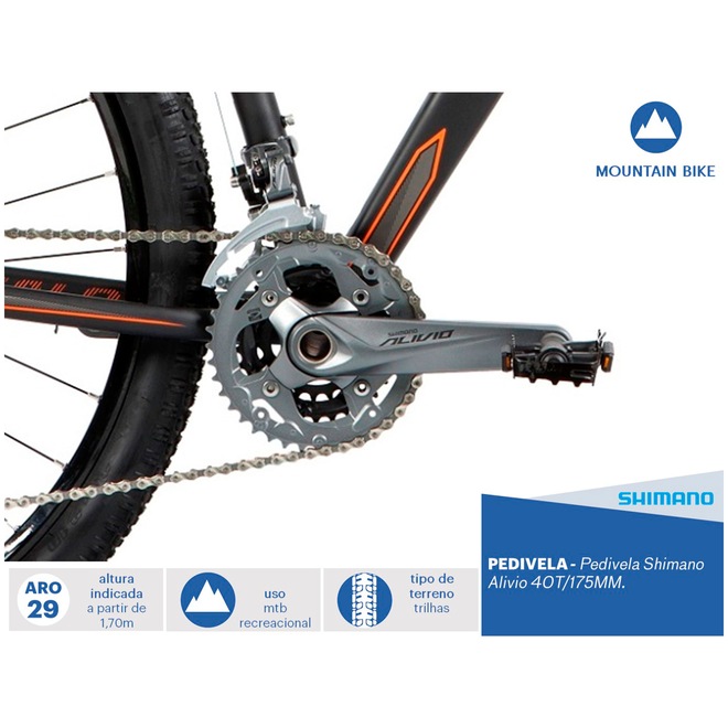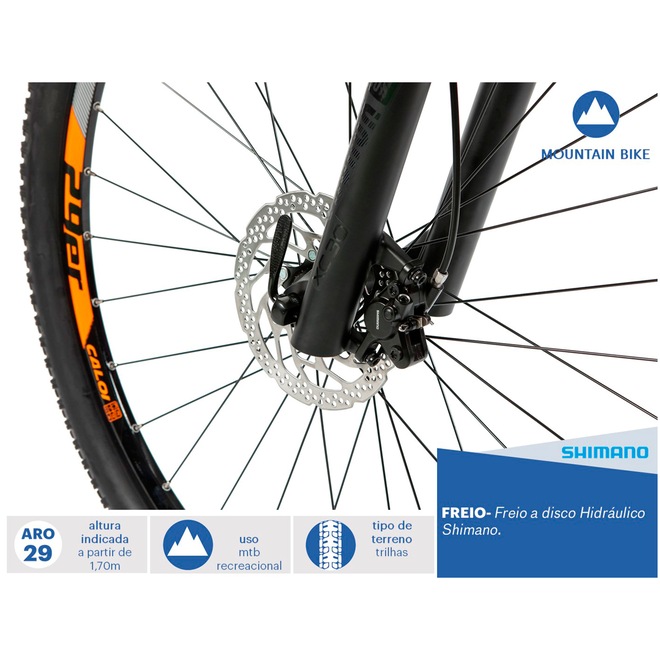 Equipada com 27 Marchas que podem personalizar seus treinos conforme o grau de dificuldade durante as pedaladas, a Bike MTB Caloi possui Freios Shimano Disco Hidráulico que otimizam a precisão e segurança em condições extremas, como trilhas, por exemplo.