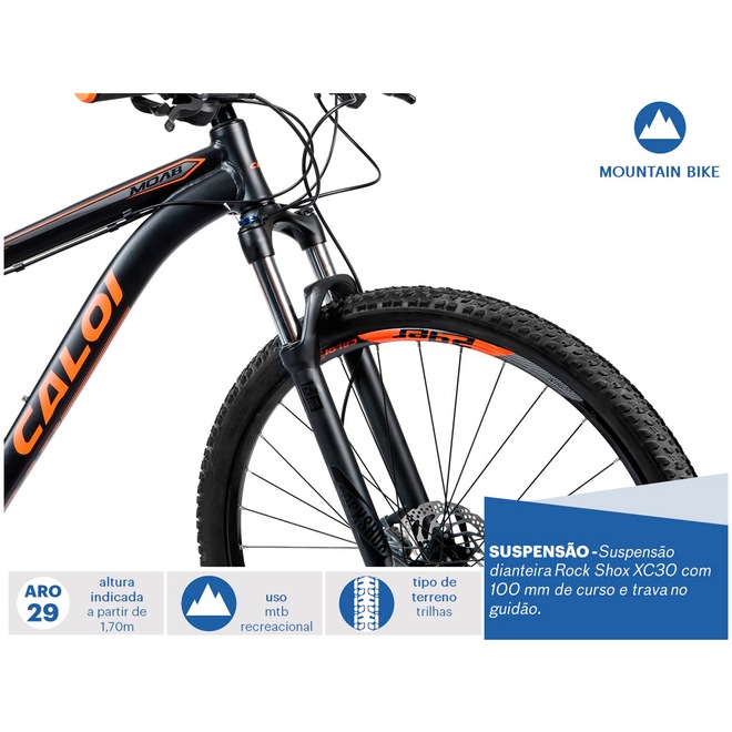Com Aro 29 que oferece maior suporte para você aproveitar todas as atividades, essa bicicleta MTB contém design geométrico que proporciona máxima estabilidade e firmeza durante a condução. Além disso, sua Suspensão é Dianteira Rock Shox com 100 mm de curso e trava no guidão.