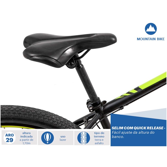 O selim com Quick Release facilita o ajuste da altura do banco. Feita para as pedaladas em terra e asfalto, a Bike Velox tem suspensão dianteira de 60mm de curso e quadro projetado em aço.