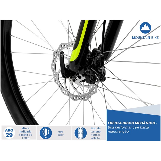 Construída com 21 Marchas, a Bike MTB Velox conta com trocador Grip System, que ajuda durante a troca das marchas. Equipada com Aro parede dupla 29 para maior suporte e resistência, essa bicicleta MTB possui Freios a Disco Mecânico que otimizam a precisão e segurança em todos os passeios, além de garantir boa performance.