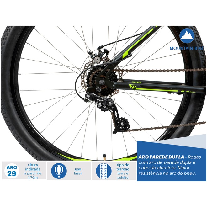 Peso Máximo Suportado (kg) 100 Quadro Aço Garfo/Suspensão Dianteira Dianteira Corrente KMC Aro 29 Raios Aro Parede Dupla Cubo Alumínio com Quick Release Cubo Traseiro Alumínio com Quick Release Pedal Plástico Pedivela Aço Movimento Central 3 partes Movimento de Direção Oversize Cassete/Roda Livre Roda Livre de 7 Velocidades Câmbio Dianteiro 03 Velocidades Câmbio Traseiro 07 Velocidades Marchas 21 Guidão Aço Curvo Alavanca do Freio Alumínio Freio Dianteiro Disco Mecânico Freio Traseiro Disco Mecânico Selim Selle Royal Canote do Selim Aço Gênero Unissex Faixa Etária Adulto Tipo Mountain Bike Ocasião de Uso Lazer / Mobilidade Garantia do Fornecedor Contra Defeito de Fabricação Conteúdo da Embalagem 1 Bicicleta Desmontada SAC do Fornecedor CALOI: 0800 701 8022 e Grande São Paulo (11) 5853-2744 Pneus MTB - 29X2,25 Manopla Grip System / PVC Mesa/Suporte do Guidão Ahead - Aço 80mm Abraçadeira do Selim Quick Release