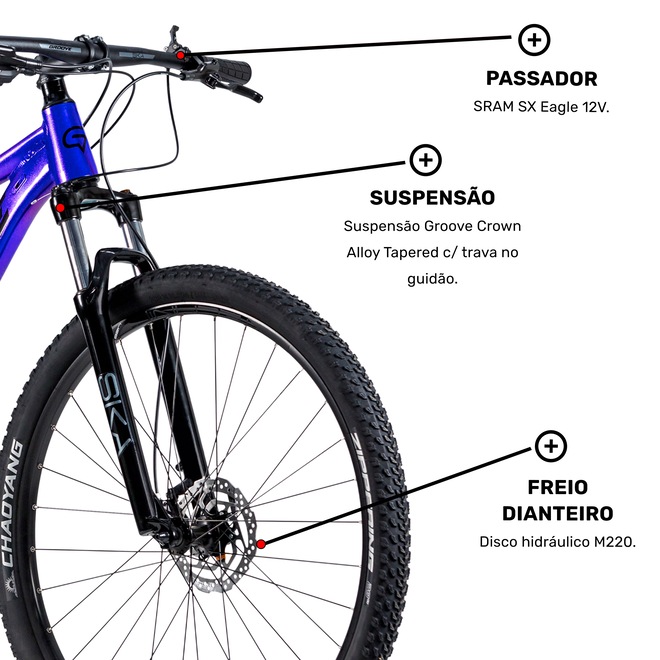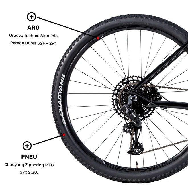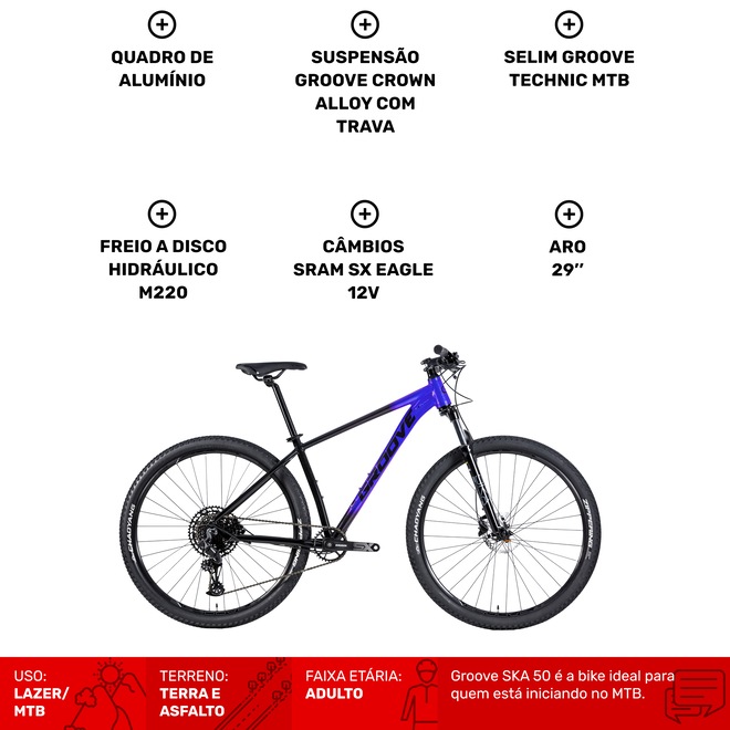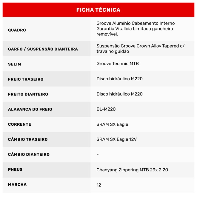 29Marchas 12 Alavanca do Freio BL-M220 Freio Dianteiro Disco hidráulico M220 Freio Traseiro Disco hidráulico M220 Manopla 22.2x135mm borracha preto Quadro Groove Alumínio Cabeamento Interno Garantia Vitalícia Limitada gancheira removivel Garfo/Suspensão Dianteira Suspensão Groove Crown Alloy Tapered c/ trava no guidão Cubo Shimano TX505 Cubo Traseiro Shimano TX505 Pneus Chaoyang Zippering MTB 29x 2.20 Câmbio Traseiro SRAM SX Eagle 12V Passador / Alavanca de Câmbio SRAM SX Eagle 12V Corrente SRAM SX Eagle Pedivela SRAM SX Eagle 32D | S (15) 170mm I M(17) - L (19) XL (20.5) 175mm Movimento Central SRAM BB Power Spline Cassete/Roda Livre SRAM Eagle 12V 11-50D Pedal Preto Eixo Cromo Canote do Selim Groove Alumínio 27.2mm Selim Groove Technic MTB Guidão Groove Technic X-Lite 740x31.8mm Backsweep 9º Mesa/Suporte do Guidão Groove Technic X-Lite (S-M) 80mm (L-XL) 90mm Peso Máximo Suportado (kg) 100 Conteúdo da Embalagem 1 Bicicleta Desmontada