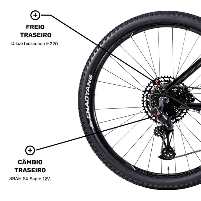 A Bike oferece câmbio SRAM SX Eagle 12V, que garante segurança, ajudando você a ter alta performance enquanto se exercita.