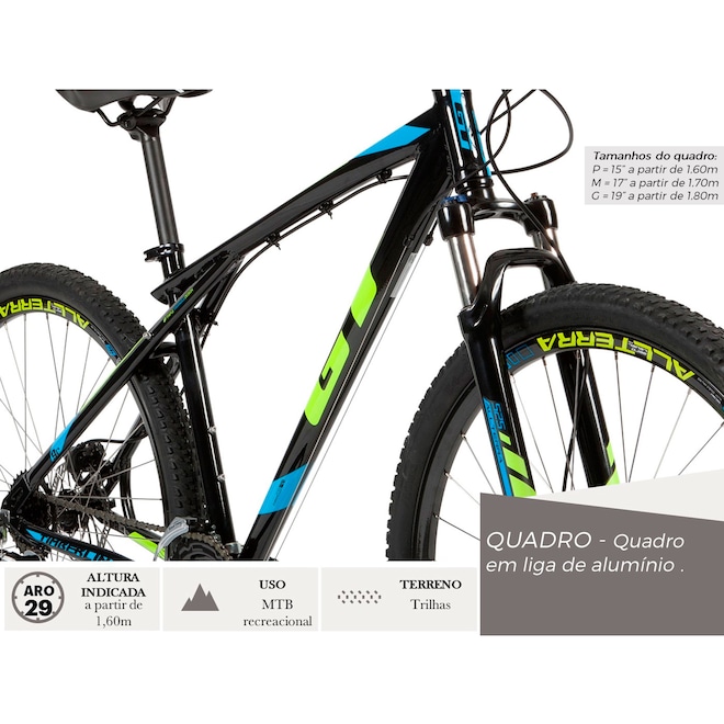 Peso Máximo Suportado (kg) 100 Quadro Alumínio Garfo/Suspensão Dianteira Suspensão Zoom 525 - 80 mm Corrente KMC Z 8.3 Aro 29 Raios Aro Parede Dupla Pedal MTB Bicolor Pedivela Prowheel alumínio 24/34/42T Movimento Central Neco B910 Movimento de Direção Ahead Cassete/Roda Livre Shimano Altus 8V Câmbio Dianteiro Shimano FD TY500 Câmbio Traseiro Shimano Acera Passador / Alavanca de Câmbio Shimano Altus Guidão Rise Bar 31,8 x 640 x 20mm Alumínio Mesa/Suporte do Guidão Alumínio Freio Dianteiro Promax Hidráulico Freio Traseiro Promax Hidráulico Selim Velo GT Abraçadeira do Selim Alumínio com Quick Release Canote do Selim Alumínio 27,2 mm x 300 mm Marchas 24 Ocasião de Uso Estrada
