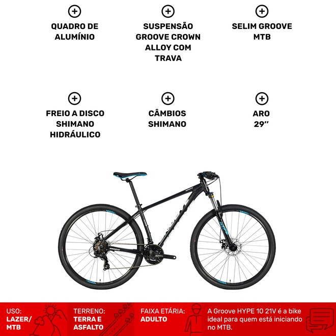 Divirta-se e ainda potencialize sua saúde física e mental com a Mountain Bike Hype 10, possui a qualidade Groove em todos seus detalhes e é a opção ideal para pessoas aventureiras que querem desfrutar sempre o melhor que a vida tem a oferecer.