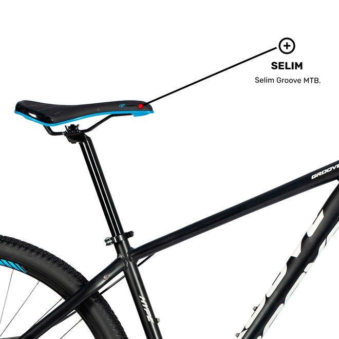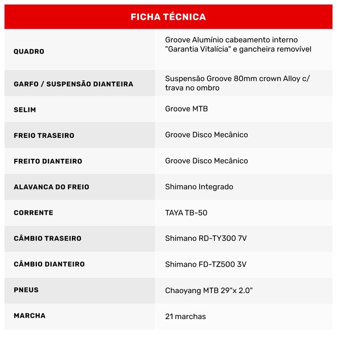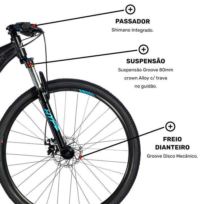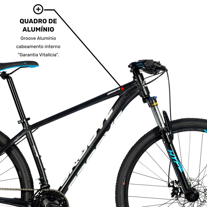 Quadro Groove Alumínio cabeamento interno "Garantia Vitalícia" Garfo/Suspensão Dianteira Suspensão Groove 80mm crown Alloy c/ trava no ombro Aro Groove Alumínio Parede Dupla 32F - 29"