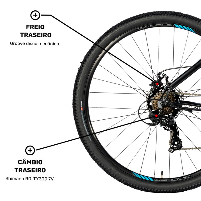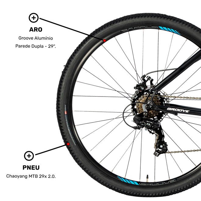 A bicicleta possui aro 29 de alumínio de parede dupla 32F, 21 marchas e freios a disco mecânico.