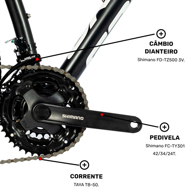 Além de, câmbios Shimano, dianteiro FD-TZ500 3V e traseiro RD-TY300 7V, corrente TAYA TB-50, pedivela Shimanos e Movimento Central selado “Smooth Tunning”.