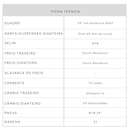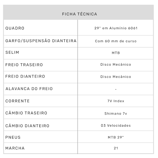 Tipo Mountain Bike Gênero Masculino Faixa Etária Adulto Aro 29 Marchas 21 Freio Dianteiro Disco Mecânico Freio Traseiro Disco Mecânico Quadro 29" em Alumínio 6061 Garfo/Suspensão Dianteira Com 60 mm de curso Folha do Aro Alumínio Parede Dupla Cubo Com Blocagem Cubo Traseiro Com Blocagem Pneus MTB 29" Câmbio Dianteiro 03 Velocidades Câmbio Traseiro Shimano 7v Passador / Alavanca de Câmbio Rapid Fire 7V Corrente 7V Index Pedivela Triplo de Aço Cassete/Roda Livre 7V Index Canote do Selim Alumínio com blocagem rápida Selim MTB Abraçadeira do Selim Alumínio com Blocagem Guidão MTB 680mm Mesa/Suporte do Guidão Alumínio Garantia do Fornecedor Contra Defeito de Fabricação Conteúdo da Embalagem 1 Bicicleta Desmontada SAC do Fornecedor SOUTHBIKE: (51) 3077-3010 ou atendimento@southbike.com.br Ocasião de Uso Treino