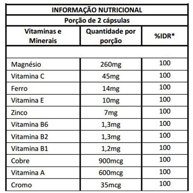 Ingredientes: Mix de vitaminas (magnésio (óxido de magnésio), vitamina C (ácido ascórbico), ferro (pirofosfato férrico), vitamina E (acetato de tocoferol), zinco (sulfato de zinco monohidratado), vitamina B6 (piridoxina), vitamina B2 (riboflavina), vitamina B1 (mononitrato de tiamina), cobre (sulfato de cobre anidro), vitamina A (palmitato de retinol), cromo (cloreto de cromo hexahidratado), selênio (selenito de sódio), vitamina H (biotina), vitamina D (colecalciferol)), antiumectante fosfato tricálcico, cápsula (gelatina, corantes dióxido de titânio INS 171, vermelho 40 INS 129, azul brilhante INS 133, azorrubina INS 122 e amarelo crepúsculo INS 110, conservante metilparabeno INS 218 e água purificada).