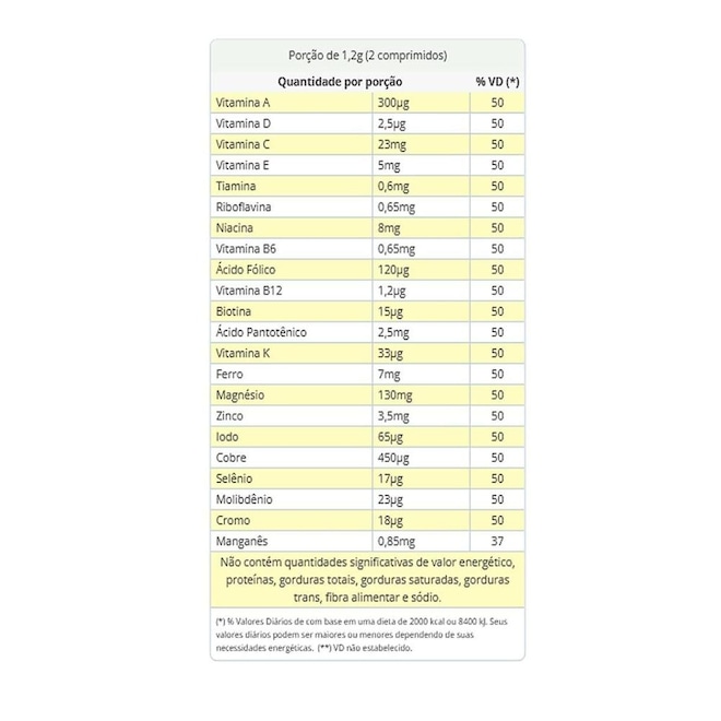 Maltodextrina, amido, óxido de magnésio, ácido ascórbico, niacina, ferro reduzido, acetato de DL alfa tocoferol, sulfato de zinco, pantotenato de cálcio, sulfato de manganês, riboflavina, cloridrato de piridoxina, tiamina, sulfato de cobre, fitomenadiona, palmitato de retinol, ácido fólico, iodeto de potássio, molibdato de sódio, cromo picolinato, selenito de sódio, d-biotina, ergocalciferol e metilcobalamina, antiumectantes estearato de magnésio, dióxido de silício, aroma e estabilizante polivinilpirrolidona.
