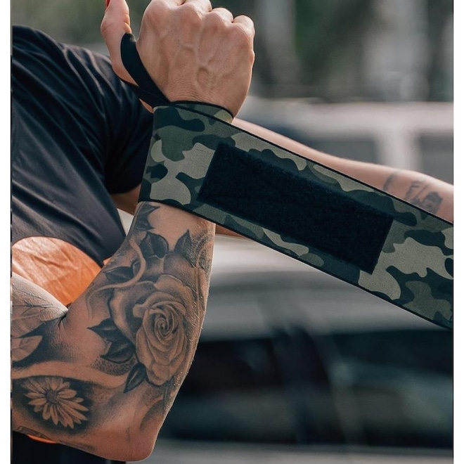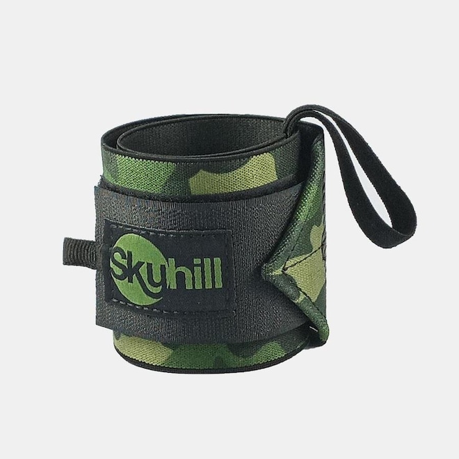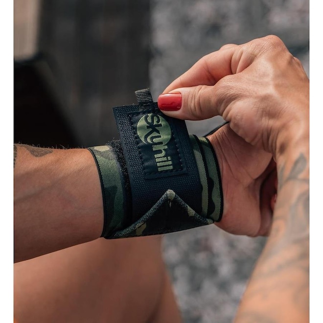 A nova Munhequeira Elástica Camuflada Skyhill proporciona maior estabilidade na execução de exercícios de levantamento de peso, ou que exijam muito dos punhos.