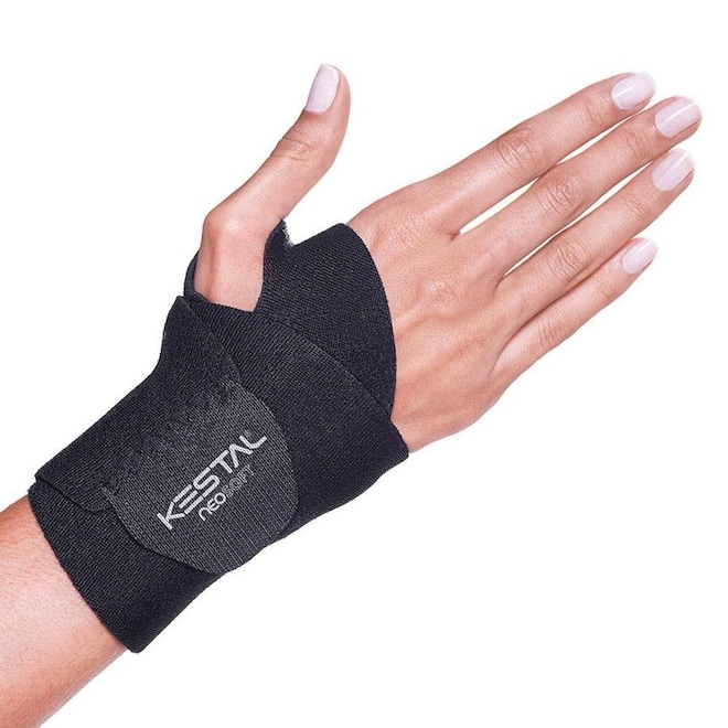 Escrita Kestal e Neosoft no velcro, acabamento reforçado, lavável, compressão ajustável através do orifício para encaixe do polegar e velcro.