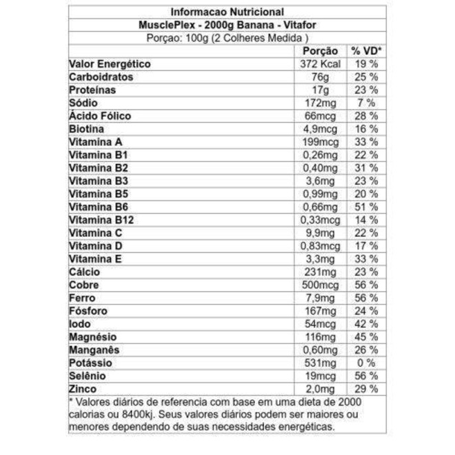 Maltodextrina, proteína concentrada do soro de leite (Whey Protein Concentrate - WPC), solágeno hidrolisado, proteína isolada do soro de leite (Whey Protein Isolada - WPI), L-leucina, polpa de banana, fosfato monopotássico (potássio e fósforo), citrato de potássio (potássio) fosfato tricálcico (cálcio e fósforo), citrato de sódio (sódio), fosfato de magnésio (magnésio), ácido ascórbico (vitamina C), pirofosfato ferrico (fero), nicotinamida (vitamina B3), acetato de tocoferol (vitamina E), sulfato de zinco (zinco), pantotenato de cálcio (vitamina B5), piridoxina Hcl (vitamina B6), sulfato de cobre (cobre), riboflavina (vitamina B2), sulfato de manganês (manganês), mononitrato de tiamina (vitamina B1), acetato de retinol (vitamina A), ácido fólico (vitamina B9), iodeto de potássio (iodo), selenito de sódio (selênio), biotina (vitamina H), colecalciferol (vitamina D), cianocobalamina (vitamina B12), aromatizante artificiais e edulcorante sucralose..