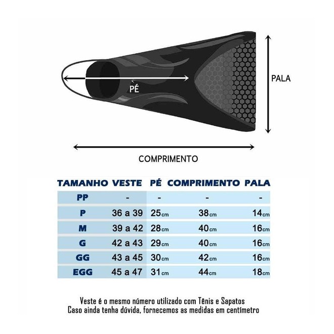 Tamanho: ( Nadadeira justa, sugerimos escolher um tamanho maior caso seu pé seja grande,)