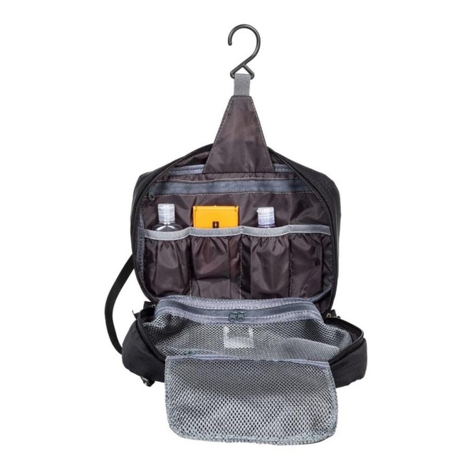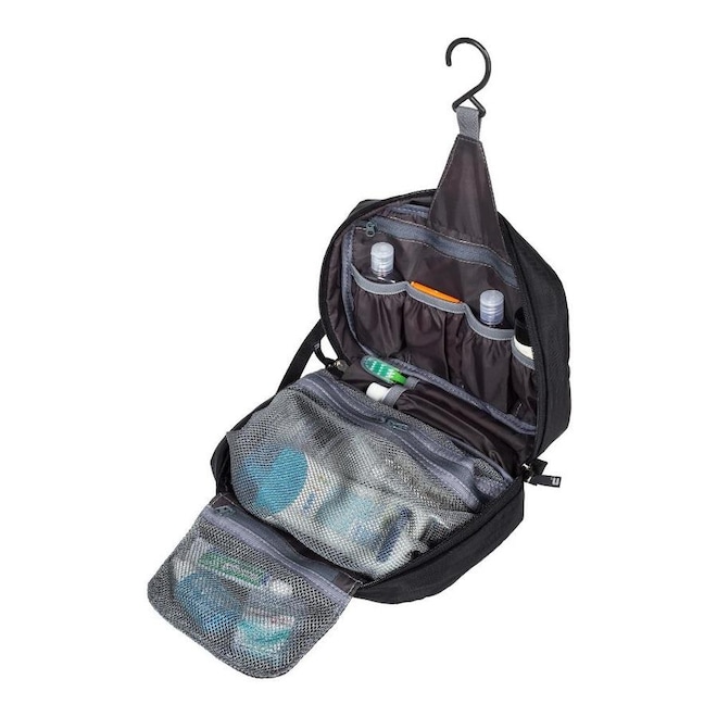 Possui fita com gancho para pendurar, várias divisões internas e bolsos internos que ajudam na organização dos itens de higiene pessoal e estética.