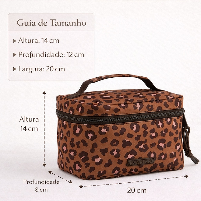 A Necessaire Farm Me Leva Viajante Safari é a solução perfeita para organizar sua rotina de beleza com sofisticação. Compacta por fora e surpreendentemente espaçosa por dentro, ela mantém seus itens essenciais protegidos e sempre acessíveis. Com a icônica estampa de onça da linha Safari e uma alça prática para transporte, esta necessaire leva funcionalidade e o estilo marcante da Farm às suas viagens, academia ou uso diário.