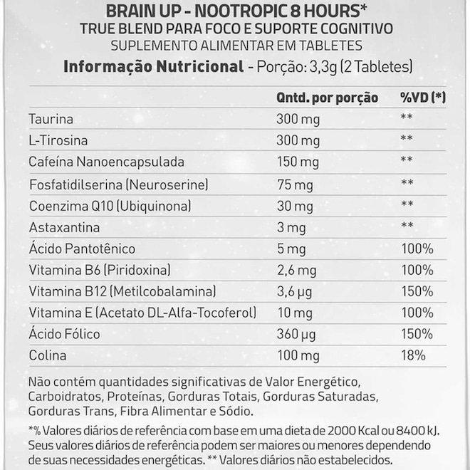 Taurina, L-Tirosina, Cafeína Nanoencapsulada, Lecitina de Soja com alto teor de Fosfatidilserina (Neuroserine), Bitartarato de Colina, Coenzima Q10, Vitamina E (Acetato DL-Alfa-Tocoferol), D-Pantotenato de Cálcio (Ácido Pantotênico), Astaxantina, Vitamina B6 (Cloridrato de Piridoxina), Ácido Fólico (Metilfolat ...ref: M18EHU