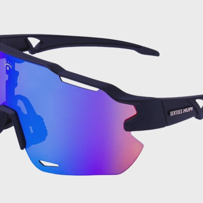 Óculos de Sol HUPI Quiriri Sertões com estrutura em TR-90 leve e resistente, lentes amplas em policarbonato e proteção UV400 contra raios UVA e UVB. Possui sistema de ventilação para reduzir embaçamento, narigueiras emborrachadas para ajuste confortável e design esportivo para alta performance. Acompanha bolsa de proteção e flanela de limpeza.