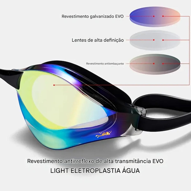 O Óculos de Natação Gold Sports Fire Pro Performance 9.0 - Lentes Espelhadas High Definition são projetados para atender às necessidades dos nadadores profissionais, com uma tecnologia anti-neblina inovadora que garante uma visão clara, mesmo nas condições mais desafiadoras. Equipado com lentes de visão 180º, anti-fog e de alta definição: Os óculos são criados com um material de silicone macio e durável que se encaixa confortavelmente ao redor dos olhos sem causar irritação ou desconforto, permitindo que você nade por horas. Nosso ajuste de nariz é projetado para máxima resistência, tornando-o resistente ao envelhecimento e capaz de se adaptar a qualquer formato de rosto compono 3 peças. Pode ser facilmente ajustado e dobrado para garantir um ajuste perfeito e seguro e com design elegante. Possui um design de perfil baixo melhorando seu deslizar através da água. Nosso óculos de natação são perfeitos para nadadores competitivos e muito mais. Se você é um iniciante ou um profissional experiente, nosso óculos é projetados para atender às suas necessidades e ajudá-lo a executar o seu melhor. Suas lentes são confeccionadas em policarbonato de ultima geração proporcionando uma visão HD, lentes com duas camadas anti-fog e uma camada protetora contra raios UVA e UVB 400. O policarbonato de ultima geração das sua lentes proporcionando uma visão HD. Armação em silicone ultra soft 3D aderindo melhor a cavidade ocular sem irritar a pele e permitindo um excelente vedação as tiras duplas são em silicone ultra soft com ajuste rápido.