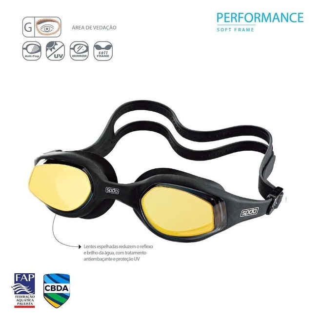 As lentes espelhadas do Speedo Tempest Mirror proporcionam maior conforto protegendo os olhos do excesso de luminosidade, pois reduz brilho e reflexo da água nos olhos. Obtenha um excelente desempenho no seu treinamento (performance) usando óculos Tempest Mirror, com proteção UV e tratamento antiembaçante (anti-fog). Projetado com tecnologia ?soft frame?, que integra ventosa, moldura e narizeira, proporciona excepcional conforto e praticidade. Área de vedação tamanho G (a vedação ocorre acima das sobrancelhas).