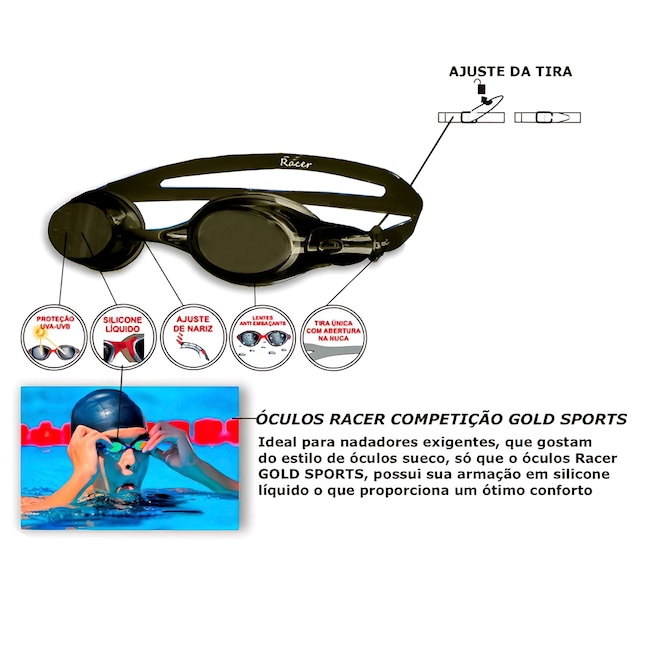 O Óculos De Natação Gold Sports Competição Racer são projetados para atender às necessidades dos nadadores profissionais, com uma tecnologia anti-neblina inovadora que garante uma visão clara, mesmo nas condições mais desafiadoras.