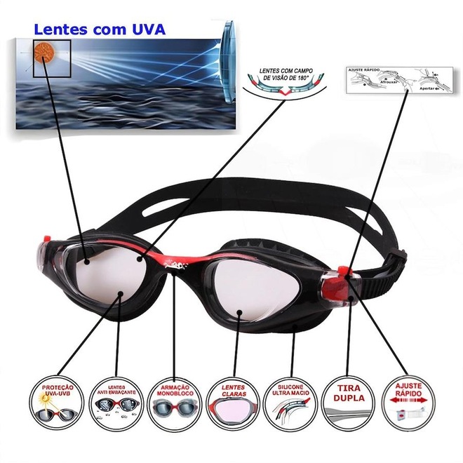 O Óculos de Natação Óculos de Natação Gold Sports Junior Champion High Definition são projetados para atender às necessidades dos nadadores profissionais, com uma tecnologia anti-neblina inovadora que garante uma visão clara, mesmo nas condições mais desafiadoras. Equipado com lentes de grande angular, anti-fog e de alta definição: Mergulhe em águas cristalinas com a ajuda de nossa grande angular, anti-fog, e lentes de alta definição que proporcionam uma experiência subaquática nítida e imersiva. Ajuste confortável: Os óculos são criados com um material de silicone macio e durável que se encaixa confortavelmente ao redor dos olhos sem causar irritação ou desconforto, permitindo que você nade por horas. Armação e tira em silicone liquido de ultima geração ultra confortável e capaz de se adaptar a qualquer formato de rosto. Pode ser facilmente ajustado. Nosso óculos de natação apresentam um design elegante e moderno . Nossos óculos de natação são perfeitos para uma variedade de atividades aquáticas, incluindo natação, mergulho e muito mais. Se você é um iniciante ou um profissional experiente, nossos óculos são projetados para atender às suas necessidades e ajudá-lo a executar o seu melhor. Suas lentes são transparente muito confortavel para picinas, suas lentes são confeccionadas em policarbonato de ultima geração proporcionando uma visão HD, lentes com duas camadas anti-fog, proteção UVA e UVB400 e são curvas proporcionando uma visão angular de 180° a armação em em silicone liquido ultra soft, tiras duplas em silicone liquido ultra soft com ajuste rápido.