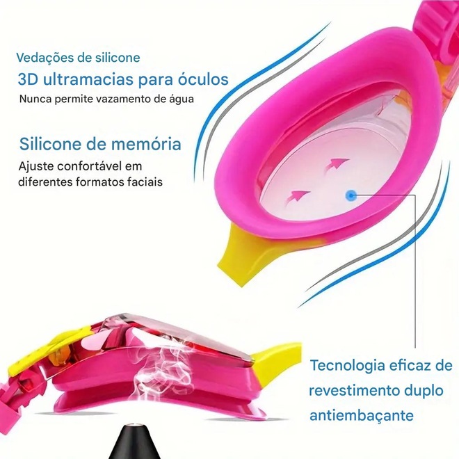 【VAZAMENTO? NÃO! 】O material de silicone premium e o design ergonômico usado nos óculos garantem um ajuste confortável em diferentes formas faciais e nunca permitem o vazamento de água.
