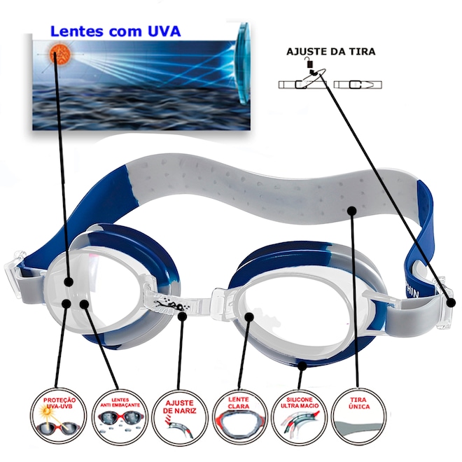 - Lentes em poli carbonato High Definition com Revestimento Anti-anti fog e camada de proteção UV. O ajuste da tira e super fácil e rápido (CLASH FÁCIL) seu gasket é em silicone ultra softh e anti alérgico com design 3D que garante conforto e encaixe super suave na cavidade ocular, sem deixar marca e provocar alergia (3D SOFT SILICONE GASKET) e também é adaptável para qualquer tipo de rosto (SNUG_FIT). Devido ao desing do projeto possui um desempenho Premium na água facilitando a sua natação. O óculos de natação é infantil com estilo peixe têm moldura em silicone suave e misturas coloridas de cores o que torna EXTRA DIVERSÃO às suas aventuras aquáticas.