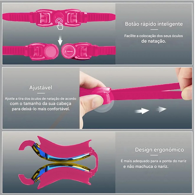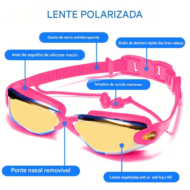 Óculos De Natação VI Polarizado - High Definition * 100% Silicone Ultra Soft* Possui um frame com gasckets projetado em design 3D impedindo a entrada de água e se adequa a qualquer rosto. Perfeito para natação.* Acessório muito necessário e útil para adultos para nadar e mergulhar.* Lentes em poli carbonato lentes Polarizadas com 100% proteção UVA. E UVB400 alem de ter uma camada de anti-embaçante ultra Pro.* Lentes com tecnologia HIGH DEFINITION, permite uma visão limpída e nitída embaixo da água.Seguro e confortável - A narizeira é flexível de silicone e mais alto, fornecem o conforto extremo que nunca ferem seu nariz ou deixam uma marca em seu rosto.Sem vazamento - Resistência melhorada em vedação a sucção excelente. A Armação é de silicone de memória (não deforma e sempre volta para seu formato original) macia e a Gasckets de duas camadas garantem um ajuste confortável em diferentes formas de rosto e mantêm a água fora dos óculos de natação para que você possa nadar livremente e com conforto.Anti-Fog & Proteção UV - As superfícies internas das lentes são revestidas pela mais recente Tecnologia de Tratamento Ambiental, evita o embaçamento dos óculos.Tiras são de silicone com ajuste rápido.A Presilia de ajuste rápida facilita o ajuste da pressão e um encaixe perfeito na cavidade ocular. Ao contrário dos designs de ajuste dos modelos antigos, o botão rápido é fácil de usar e não puxa o cabelo.vem com uma mesh bag