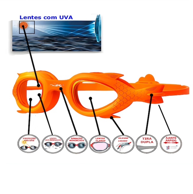 4. Lentes clara: Óculos de natação, você pode desfrutar do mundo subaquático de relance. As lentes anti-embaciamento HD evitam que o vapor de água afete a sua visão, dando-lhe uma visão clara e transparente docenário aquático. Suas lentes são em poli carbonato de ultima geração, possui camada de proteção UVA e UVB e anti embaçante.