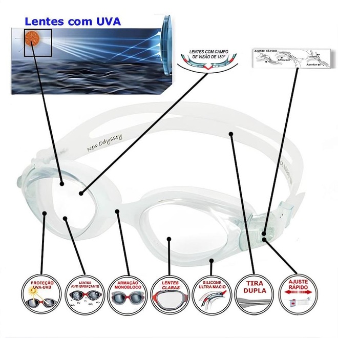 O Óculos De Natação Gold Sports Odyssey - High Definition 180° De Visão são projetados para atender às necessidades dos nadadores que desejam conforto, com uma tecnologia anti-neblina inovadora que garante uma visão clara, mesmo nas condições mais desafiadoras. Equipado com lentes de grande angular, anti-fog e de alta definição: Mergulhe em águas cristalinas com a ajuda de nossa grande angular, anti-fog, e lentes de alta definição que proporcionam uma experiência subaquática nítida e imersiva. Ajuste confortável: Os óculos são criados com um material de silicone macio e durável que se encaixa confortavelmente ao redor dos olhos sem causar irritação ou desconforto, permitindo que você nade por horas. Armação e tira em silicone de ultima geração ultra confortável e capaz de se adaptar a qualquer formato de rosto. Pode ser facilmente ajustado.Nossos óculos de natação apresentam um design elegante e moderno que é certo para virar a cabeça na piscina. Com uma escolha de cores elegantes e um ajuste de perfil Grande, você vai olhar e se sentir bem confortável em seu rosto podendo nadar por horas sen deixar marcas em seu rosto. Uso versátil. Nossos óculos de natação são perfeitos para uma variedade de atividades aquáticas, incluindo natação,Triatlon e muito mais. Se você é um iniciante ou um profissional experiente, nossos óculos são projetados para atender às suas necessidades e ajudá-lo a executar o seu melhor. Suas lentes são translucidas muito confortável para picinas fechadas, suas lentes são confeccionadas em poli carbonato de ultima geração proporcionando uma visão HD, lentes com duas camadas anti-fog, proteção UVA e UVB400, armação em em silicone liquido ultra soft, tiras duplas em silicone ultra soft com ajuste rápido.