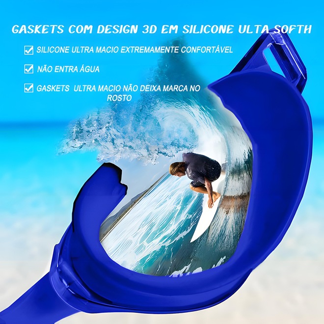 * Possui um frame com gasckets projetado em design 3D impedindo a entrada de água e se adequa a qualquer rosto. Perfeito para natação.