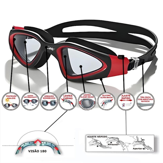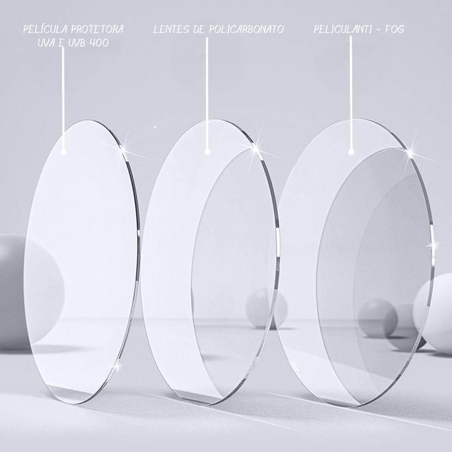 Composição: Lente: PC, Junta: Silicone, Tiras: Silicone