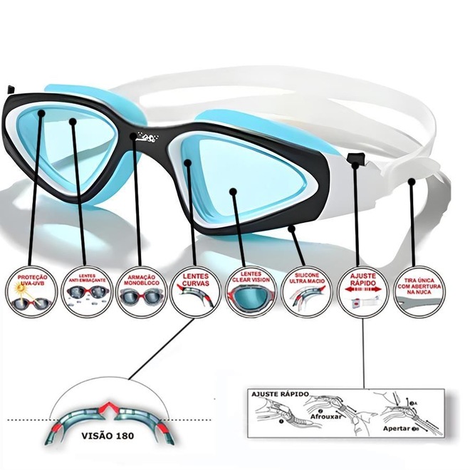 Composição: Lente: PC, Junta: Silicone, Tiras: Silicone